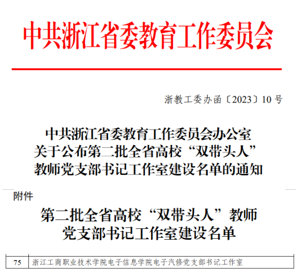 近日,中共浙江省委教育工委发布《关于公布第二批全省高校“双带头人” 教师党支部书记工作室立项建设名单的通知》,我校电子信息学院电子汽修党支部书记工作室获批立项。
