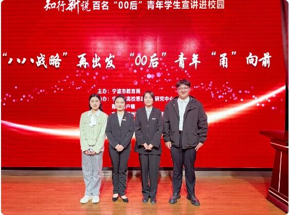 此外,学校还先后组建了在甬高校“后浪”宣讲团、“知行新说”00后青年学生宣讲团等,学校青年学生宣讲员郑安琪走进宁波市鄞州职业高级中学,围绕党的二十大精神主题,借助新媒体手段,通过“讲理论+谈实践”等形式,将党的二十大报告中关于乡村振兴、共同富裕等重要论述化作身边理、身边事,收获好评。