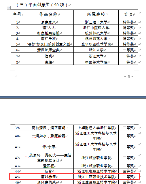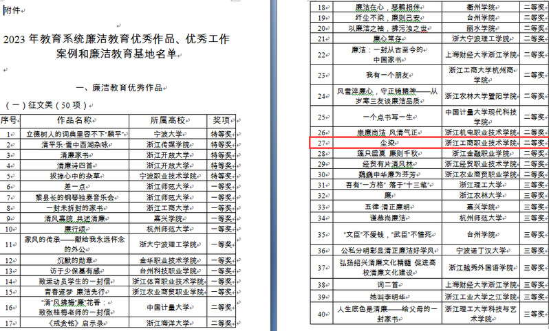 2023年5月15日,中共浙江省委教育工作委员会办公室发布《中共浙江省委教育工作委员会办公室关于公布2023年教育系统廉洁教育优秀作品、优秀工作案例和廉洁教育基地名单的通知》,我校选送王国庆老师指导的钱冰慧同学征文作品《尘染》、周薇老师指导的王欣悦同学设计作品《廉以养德》喜获廉洁教育征文类二等奖、平面创意类三等奖。
