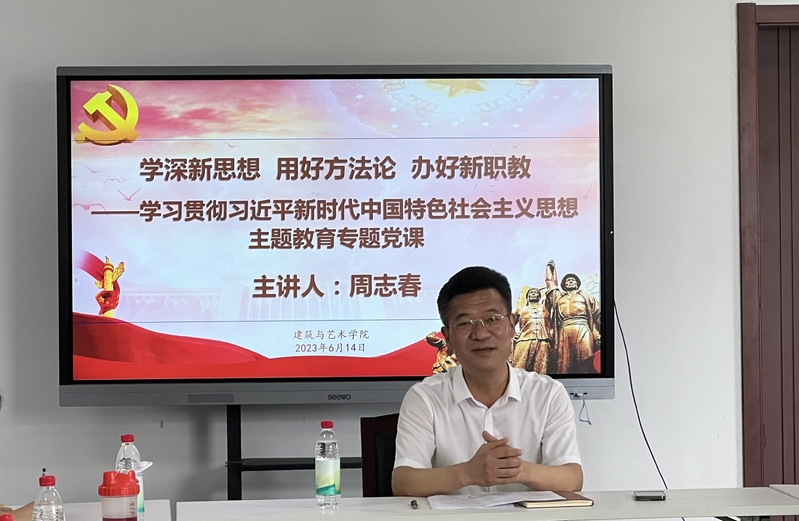 周志春以《学深新思想、用好新方法、办好新职教》为题给建筑与艺术学院全体教职工和行政第二党支部全体党员上党课。他从“提高政治站位,深刻认识把握‘新思想’的重大意义和丰富内容”“把握核心要义,深刻理解并用好‘新思想’的世界观和方法论”“加强师德师风教育,高站位落实立德树人根本任务”三个方面展开,结合自身学习体会和工作思考,从现阶段国家的经济形势分析入手,重点解读了“六个必须坚持”的内涵要求,指出“六个必须坚持”是习近平新时代中国特色社会主义思想活的灵魂,系统概括了习近平新时代中国特色社会主义思想的立场观点方法,集中体现了习近平新时代中国特色社会主义思想的精髓要义,要运用蕴含其中科学的世界观和方法论引领、指导和推动学校事业发展。
