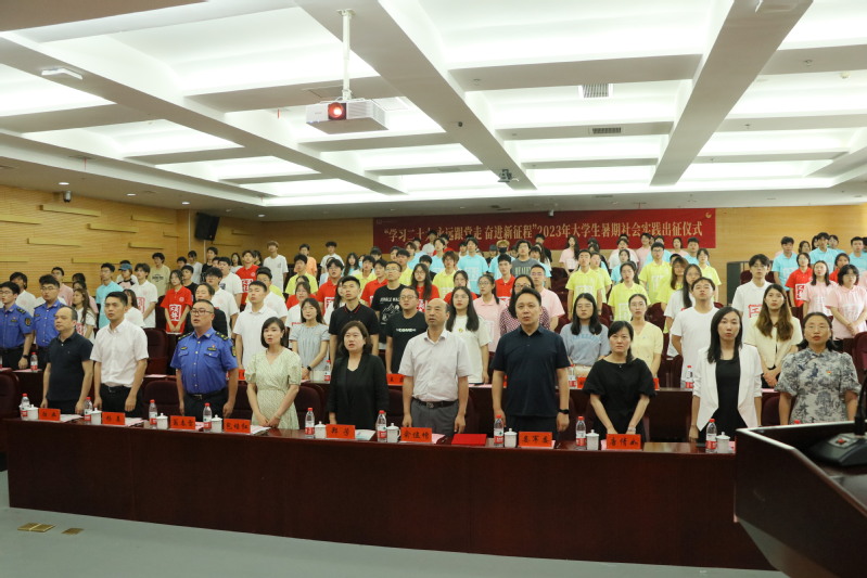 活动在庄严的国歌声中拉开序幕。俞位增在讲话中充分肯定了2022年大学生暑期社会实践活动取得的成果,指出2023年是全面贯彻落实党的二十大精神的开局之年,也是共青团紧跟党迈上新的百年青春征程的起步之年,号召全体青年在强国建设民族复兴新征程上唱响青春之歌。他鼓励同学们要更深入地了解社会、认识国情,增长才干,增强社会责任感,同时在观察实践中学党史、强信念、跟党走,同时还就暑期社会实践工作提出三点希望:第一希望各部门、各学院牢固树立安全第一的观念,提高思想认识、加强组织管理、明确团队纪律,做好社会实践活动的安全保障工作;第二希望广大教师主动参与暑期社会实践工作,当好社会实践的带头人、贴心人和引路人;第三希望同学们围绕“学习二十大”的主题,面向实际,深入实践,讲好新时代的工商故事,在感受我国经济快速发展和社会长期稳定的生动实践中厚植爱党、爱国、爱校情感,不断增强青年人的志气、骨气、底气。