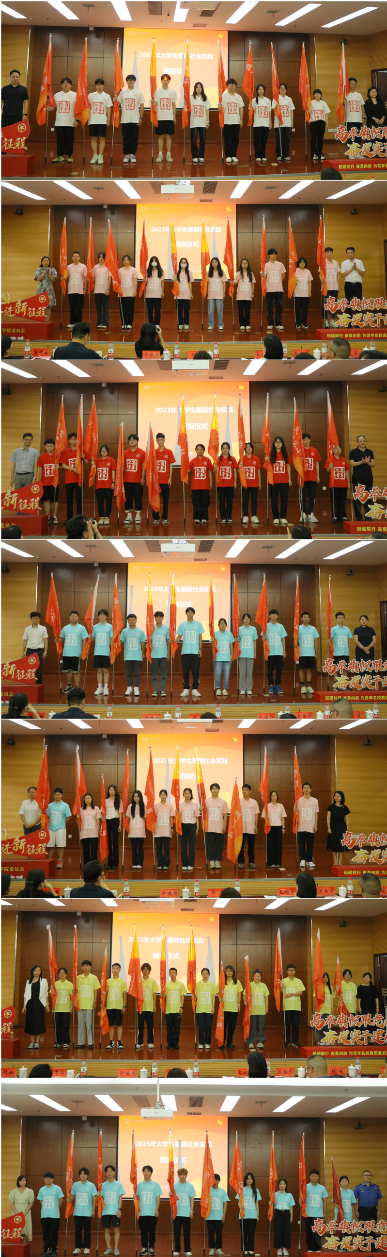 相关部门负责人、各学院党总支(副)书记为即将出征的团队授旗。