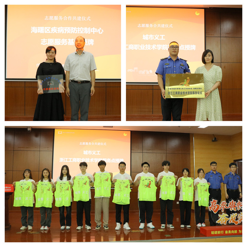随后,俞位增为学校新建立的志愿服务基地——海曙区疾控中心授牌;海曙区综合行政执法局团委书记翁春雷书记及校团委书记包培红为我校服务点授牌,并为校城管义工志愿者团队成员代表发放志愿者服。
