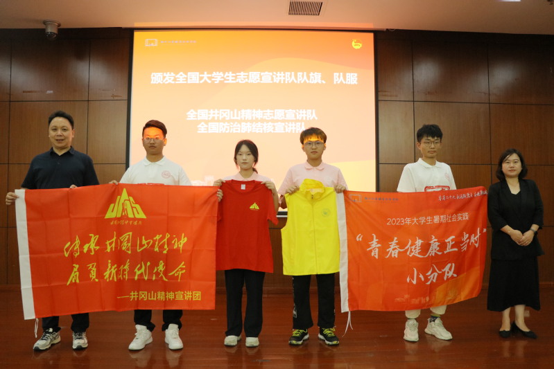 学工部部长、学生处处长郑芳、教务处处长娄军委为我校全国大学生井冈山精神志愿宣讲队、全国大学生防治肺结核宣讲队颁发队旗队服。