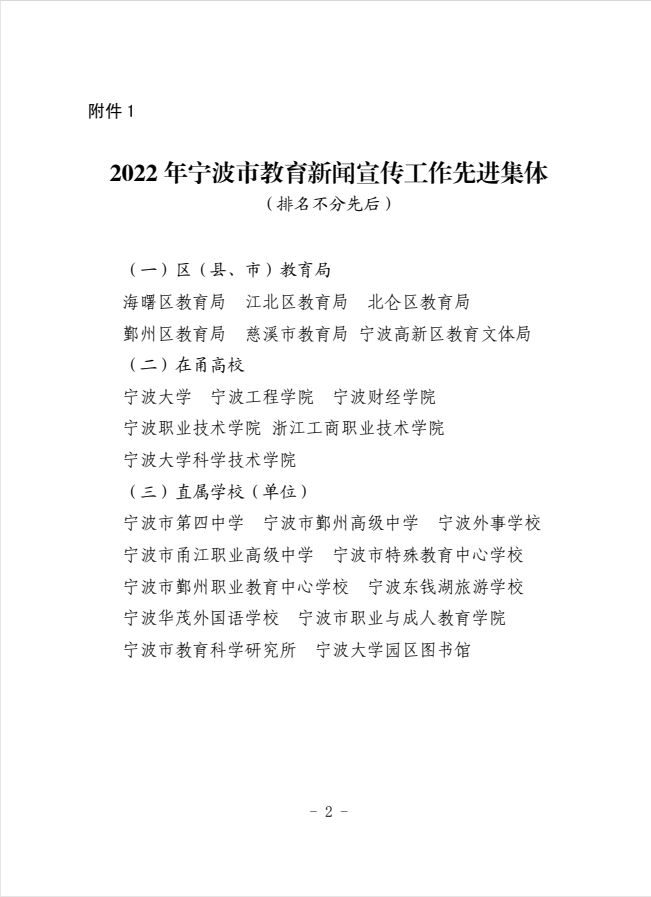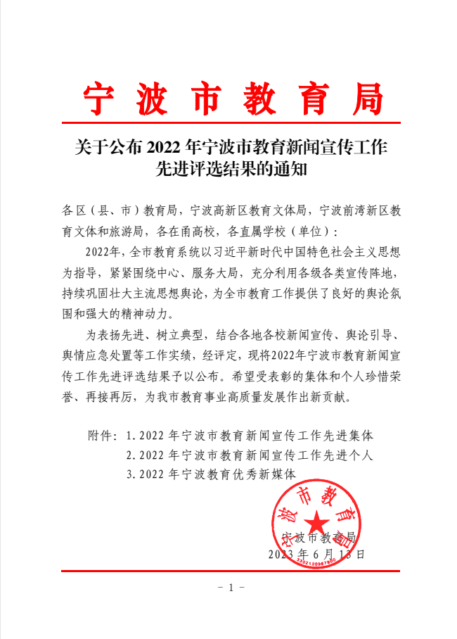 日前,根据宁波市教育局《关于公布2022年度宁波市教育新闻宣传工作评选结果的通知》,我校获评2022年度宁波市教育新闻宣传工作先进集体,学校微信公众号获评2022年度宁波市教育优秀新媒体,宣传部姚敏明老师获评2022年度宁波市教育新闻宣传工作先进个人。这也是我校自2020年以来,连续第三次获评宁波市教育新闻宣传工作先进评选的所有奖项。