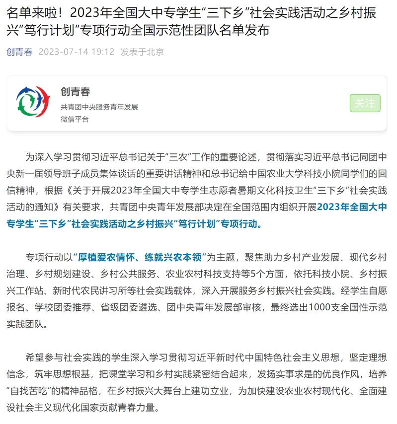 近日,由共青团中央青年发展部在全国范围内组织的2023年全国大中专学生“三下乡”社会实践活动之乡村振兴“笃行计划”专项行动全国示范性团队名单揭晓,我校2支社会实践团队在本次活动中脱颖而出成功入围,并成为浙江省唯一入围两支团队的高职院校。