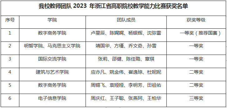 浙江省教学能力比赛是省内覆盖最广、影响最大的高职院校教师教学竞赛,是浙江省职业教育打造“业务精良、充满活力”的高素质专业化教师队伍的重要支撑,也是浙江省职业院校展示教育教学与时俱进的重要平台。本次大赛吸引了来自全省48所高职院校310件参赛作品,经过专家网络初评、现场决赛,共评出一等奖32项,二等奖64项,三等奖93项,推荐14件作品参加2023年全国职业院校技能大赛教学能力比赛。