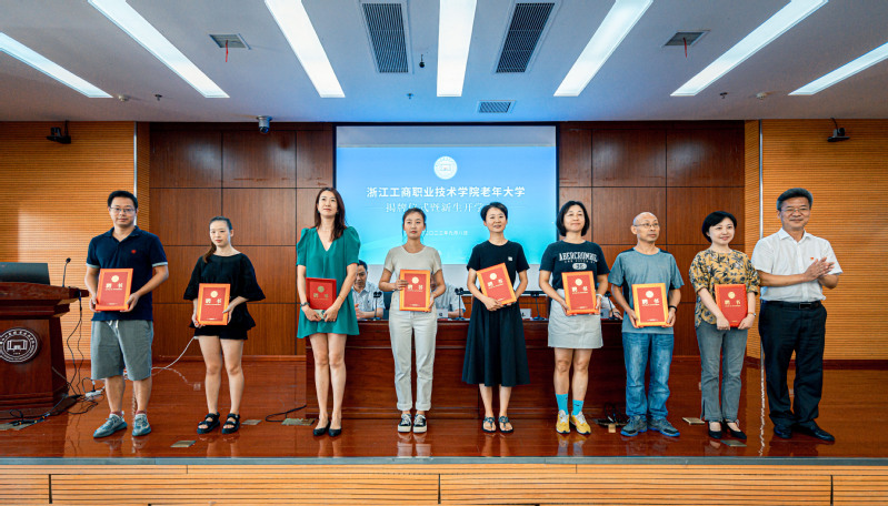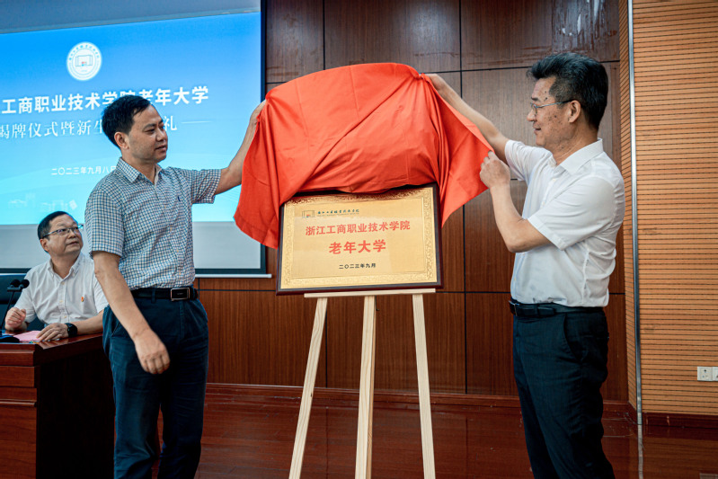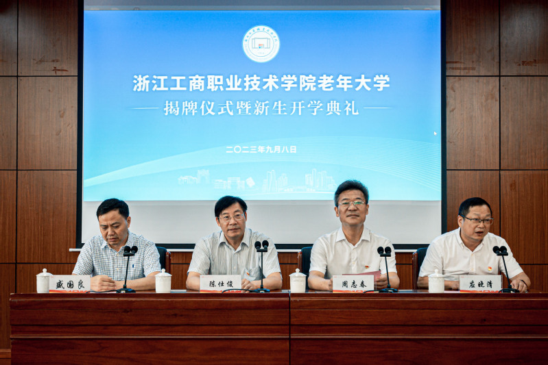 典礼第一阶段,应晓清首先宣读《关于成立浙江工商职业技术学院老年大学的通知》文件;盛国良、周志春共同为“浙江工商职业技术学院老年大学”揭牌。