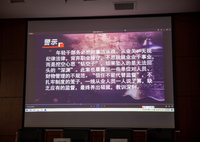 首先,全体与会人员观看了警示教育片《系好“第一粒扣子”——近年我省年轻干部违纪违法案件警示录》;教育片从不同角度、不同层面选取了六个典型案例,给与会者以警示,收到了很好的教育效果。