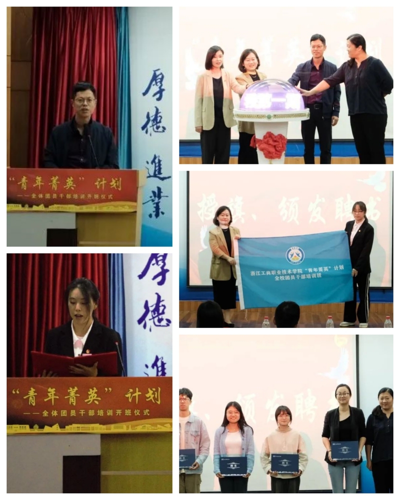 学工部部长、学生处处长郑芳为“青年菁英”计划培训班授旗,组织部副部长李媛媛为“青年菁英”计划培训班特聘授课教师颁发聘书。学员代表上台发言,表示在加强学习的基础上努力争做服务型团干,在服务同学的同时带领班级青年学生积极进取,努力奋斗!