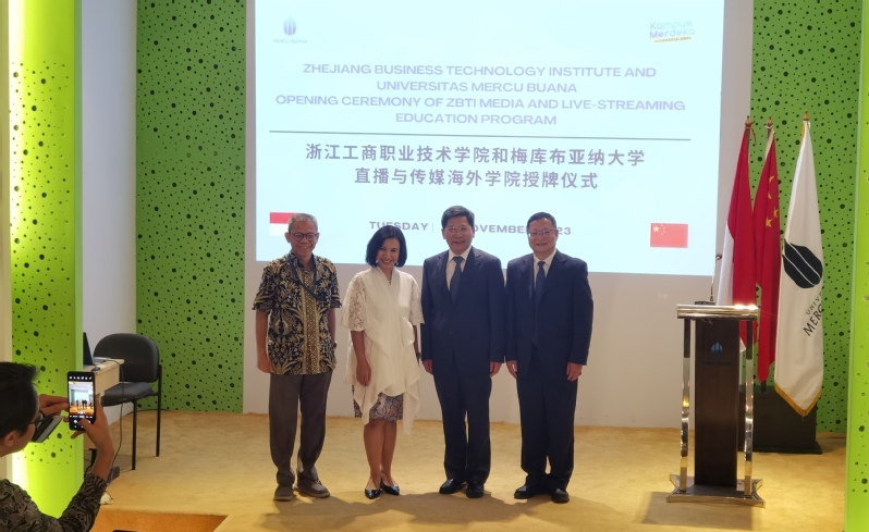 浙江省高等教育代表团一行赴梅库布亚纳大学现场参观并见证 “直播与传媒海外学院”的授牌仪式。浙江省委教育工委专职副书记、省教育厅党组副书记陈春雷出席授牌仪式并致辞,来自浙江师范大学、浙江理工大学、浙江工商大学等9所省内高校的领导见证了“直播与传媒海外学院”的授牌仪式。我校利用本校优势专业,针对跨境电商、数字经济和现代服务行业的专业人才培养,积极开展与印度尼西亚梅库布亚纳大学合作共建“直播与传媒海外学院”工作。通过“直播与传媒海外学院”的建设,将在加强与“一带一路”国家的教育和人文交流合作、加强高职院校国际化办学质量、开展人才技能培训和服务国际产能合作等方面发挥重要作用。