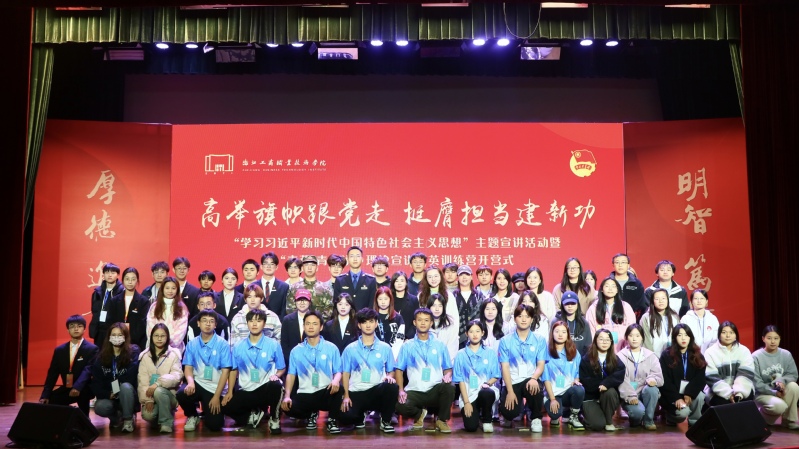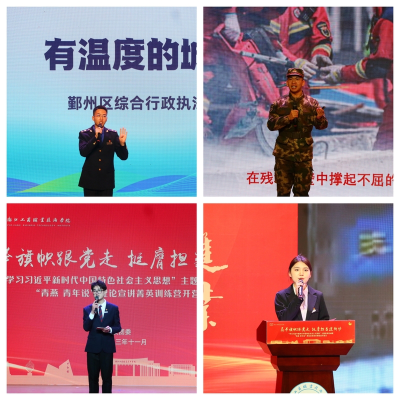 活动现场还举行了“学习习近平新时代中国特色社会主义思想”主题宣讲。校团委邀请了各级优秀宣讲员给现场的师生带来了精彩纷呈的示范宣讲。其中包括有:鄞州区“鄞铃”宣讲团骨干、鄞州区综合执法局干部严明带来的《有温度的城管人》;2023年省思政微课特等奖、鄞州区青春红匠宣讲员、浙大宁波理工学院叶洪轩同学带来《追寻心中的三道光》;宁波市“知行新说”青年宣讲团、校“清风习习”宣讲团的李敏伟同学带来《“共富路上,垦荒精神不能丢”》;校“清风习习”宣讲团吴璐婷同学带来《浙里一抹红——红帮裁缝的前世今生》。