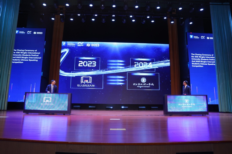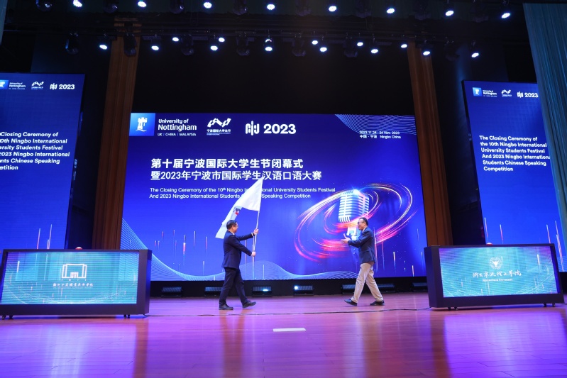 11月24日下午,在宁波诺丁汉大学举行的闭幕式暨2023宁波市国际学生汉语口语大赛中,我校副校长应晓清将宁波国际大学生节会旗交接个下一届举办单位浙大宁波理工学院,本届大学生节圆满成功。本届国际大学生节的成功举办有助于更好地对外介绍宁波,增进国际人文交流,传承和弘扬中华优秀传统文化。