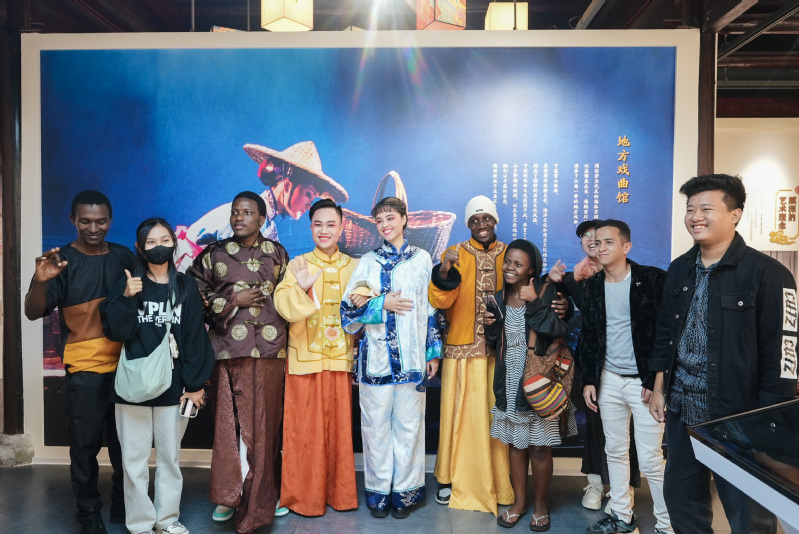 11月23日下午,国际大学生们赴慈城周信芳戏剧艺术馆体验地方优秀的传统戏曲文化,欣赏了越剧经典选段、京剧改编的歌曲、川剧变脸等节目,还在演员老师的指导下实践学习了甩水袖、走台步、戏曲身段等,切身体会到传统戏曲艺术的精妙。