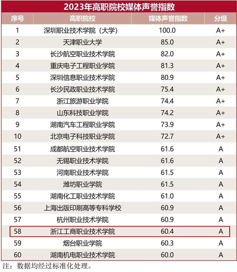 11月24日,中国人民大学评价研究中心正式发布2023年高职院校媒体声誉指数,我校入选2023高职院校媒体声誉总指数前60名榜单,位列第58位。
