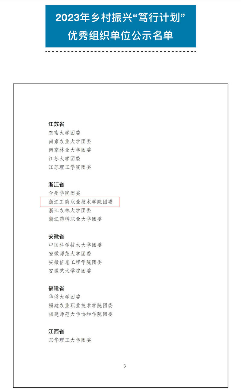为进一步深化育人实效,强化经验总结、典型示范,共青团中央针对乡村振兴“笃行计划”专项行动开展表彰活动,经自主申报、择优推荐、组织评审等环节,98个“笃行计划”专项行动优秀组织单位、95个优秀实践团队、89名优秀实践个人拟受表扬。我校荣获“优秀组织单位”荣誉称号,浙江省共4所高校获此荣誉,我校为唯一一所高职院校。