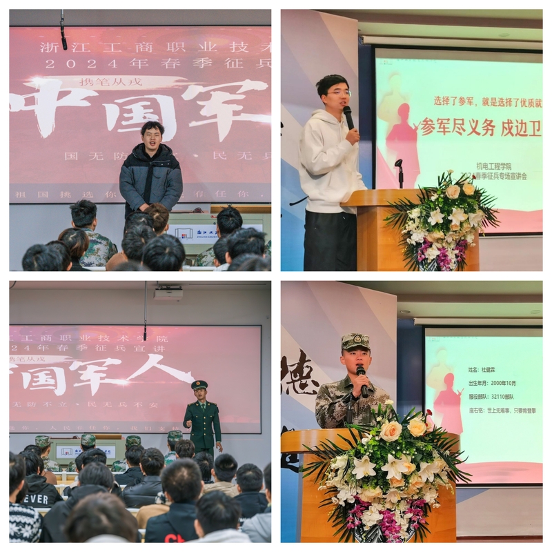 退伍大学生洪武、吴盼毅、余晟、梅一杰、沈立骏、金可伟、李继华、余可也、杜健霖、劳铭波10名同学讲述了自己在军队中的生活,他们表示:军旅生涯虽然艰辛,但那些经历却成为了人生中最宝贵的财富。在场的学生纷纷表示,通过征兵宣讲和学长们军旅生涯分享,让他更加清楚的认识到参军入伍是一次锻炼意志、磨练品质、提升能力的难得机会,更加坚定参军的决心!