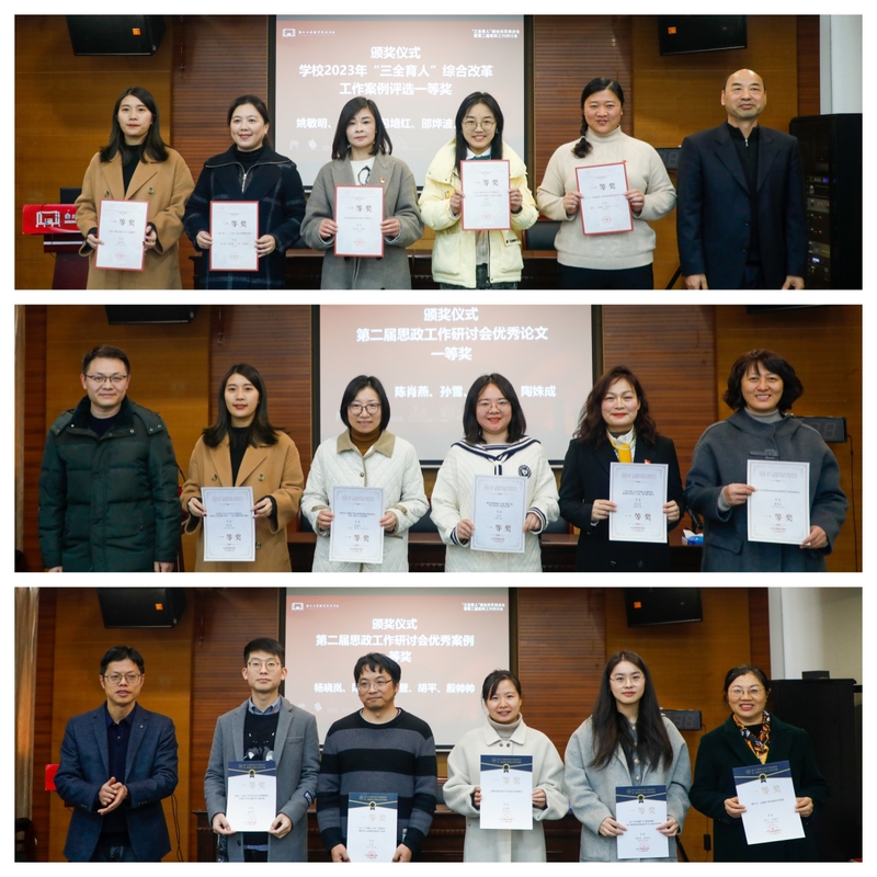 会上首先宣读了学校2023年“三全育人”综合改革工作案例评选结果、第二届思政工作研讨会优秀论文获奖名单和优秀案例获奖名单,俞位增、张启富等分别为优秀案例(论文)一等奖获得者颁奖。