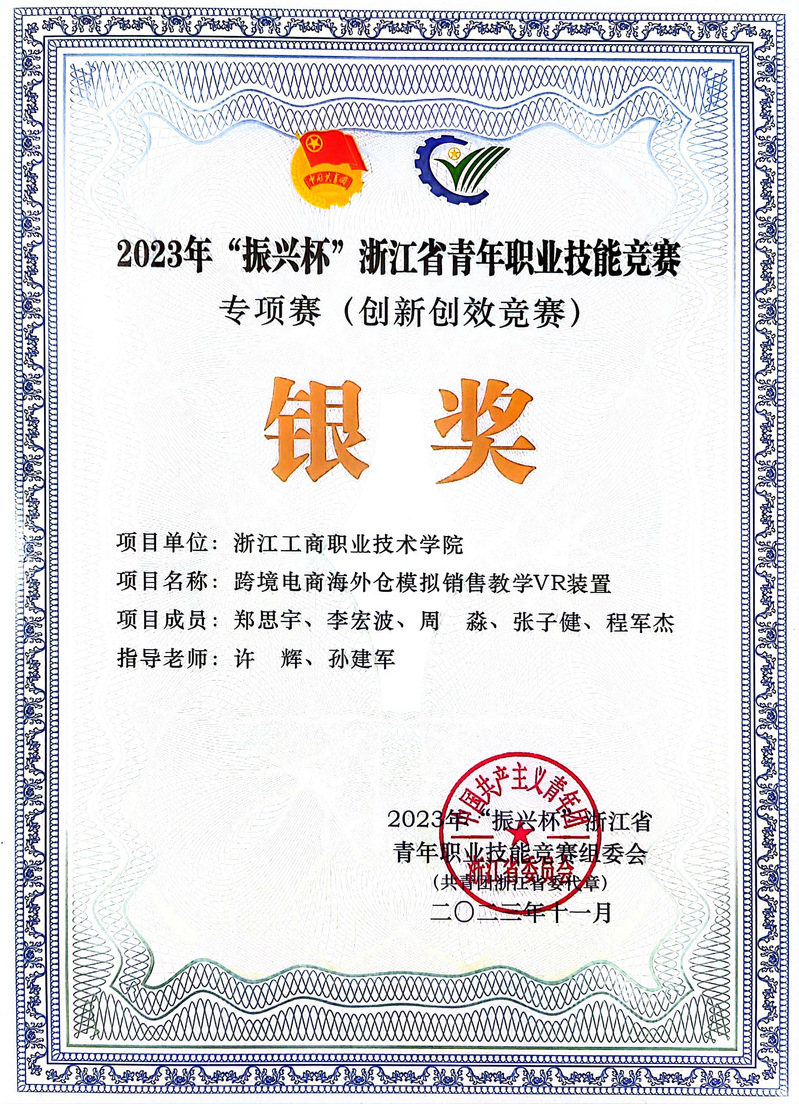 近日,2023年“振兴杯”浙江省青年职业技能竞赛落下帷幕,我校推送项目“跨境电商海外仓模拟销售教学VR装置”(指导教师许辉、孙建军)从众多优秀作品中脱颖而出,收获银奖,创学校参赛以来历史最好成绩。