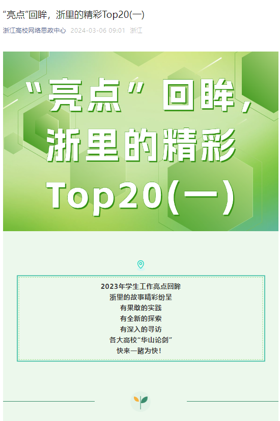 近日,浙江省高校网络思政中心公布了《2023年学生工作亮点回眸TOP20》,我校报送的学生思政工作典型案例《培优赋能,打造一流辅导员队伍》从全省100多所高校报送的300余项典型案例中脱颖而出,成功进入前20,成为全省展示的亮点工作之一。这一成果的获得,充分展示了我校在辅导员队伍建设方面的显著成效,不仅是对我校近年来辅导员队伍建设工作的肯定,更是对我校未来工作的鞭策和激励。我校将以此为契机,进一步完善、创新具有工商特色的辅导员素质能力提升品牌项目,为浙江省高职院校思政育人工作的推进提供工商方案。