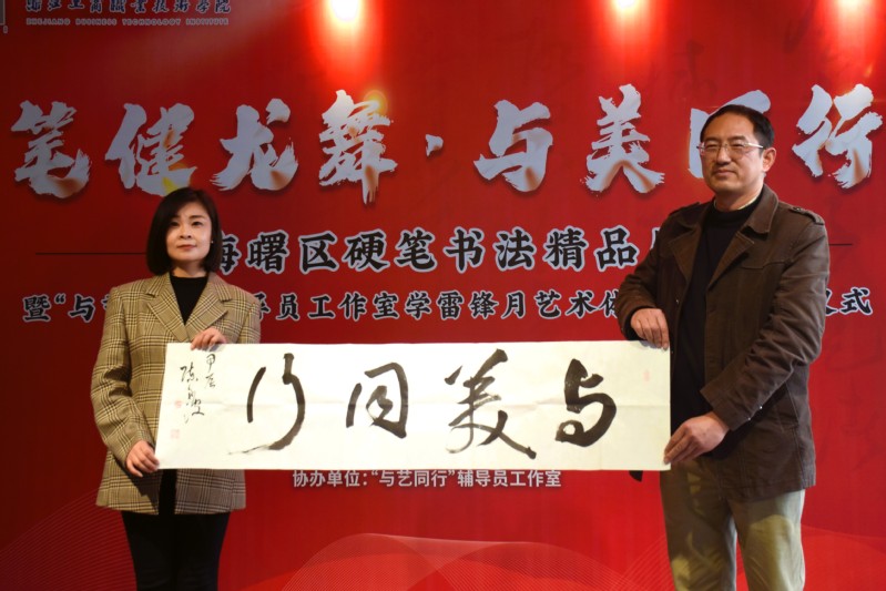 协会副主席陈舟波代表协会向学院赠送了书法作品,内容为“与美同行”,团委书记包培红代表学校接受作品。