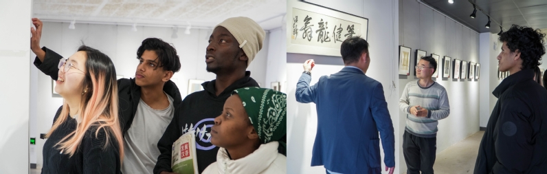 出席仪式的全体人员一起参观了展览。本次展出的作品创作书体涵盖了金文、简牍、帛书等在内的篆隶楷行草等多种书体,呈现出扎实功底、娴熟章法、淋漓笔墨和独特风韵,具有很强的观赏性和感染力,在继承传统、守正创新中,反映出新时代海曙区硬笔书法艺术发展和繁荣的新气象。值得一提的是,本次展览也吸引了校内留学生观看,协会成员们还和大家进行了现场交流,同学们对当代硬笔书法的形式和风格发展表示惊叹和敬佩。