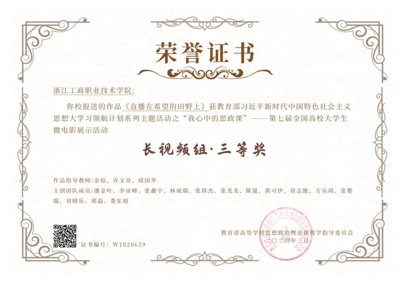 近日,我校正式收到2023年教育部习近平新时代中国特色社会主义思想大学习领航计划系列主题活动之一——第七届“我心中的思政课”全国大学生微电影展示活动的荣誉证书。据悉,此次大学生微电影展示活动共收到来自全国834所高校报送的2178份作品,共评选出获奖作品339项。我校马克思主义学院报送的微电影作品《直播在希望的田野上》喜获长视频组三等奖。