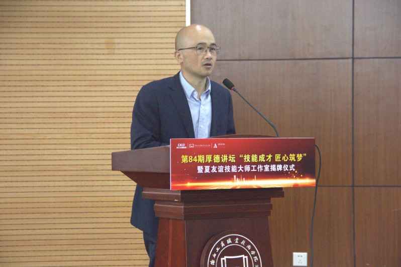 活动现场,夏友谊作为本期厚德讲坛主讲人作专题报告。夏友谊曾先后荣获“全国五一劳动奖章”、“浙江金蓝领”、“全国青年岗位能手”、“中国住房和城乡建筑行业技术能手”等荣誉,他以“技能成才,匠心筑梦”为主题与在场师生代表分享了自己从基础学徒到技能大师的成长之路与心得体会。夏老师强调,工匠精神的内核是严谨专注、精雕细琢,是寻求突破、勇于创新。时代愈是高速发展,愈需要新一代青年学子践行工匠精神。