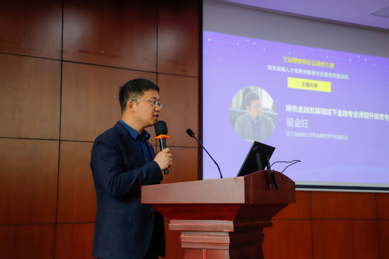 紧接着,浙江金融职业学院金融管理学院副院长吴金旺以《绿色金融发展视域下金融专业课程升级思考》为题,在阐释了“金融强国”、“五篇大文章”、“绿色金融”由来及含义的基础上,界定了绿色金融的行业范畴及岗位需求,从而从“岗课证赛”综合育人的角度提出了课程改革与建设的升级思路及举措。