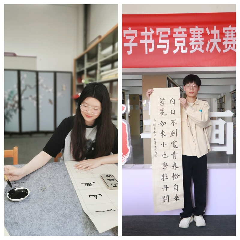 该比赛分硬笔书法和毛笔书法两个赛项,每个赛项12名选手同台竞技。选手们聚精会神,或凝视构思,或挥毫泼墨,沉浸在自己的创作之中。彼时正值暮春时节,校园里花香阵阵,书画角翰墨飘香,一点一提、一横一竖、一撇一捺,“逆入、涩行、紧收”,选手们笔走龙蛇,用工商学子的才情诠释着汉字之美。现场一有作品完稿,书法社的同学们便将作品送交评委老师,老师们则当场点评、细心指导并完成评分,这种点评、指导与评分相结合的方式让选手们受益匪浅。赛后,刘老师与张老师相继挥毫,亲自示范,在围观同学的一片欢呼声中,比赛圆满结束。