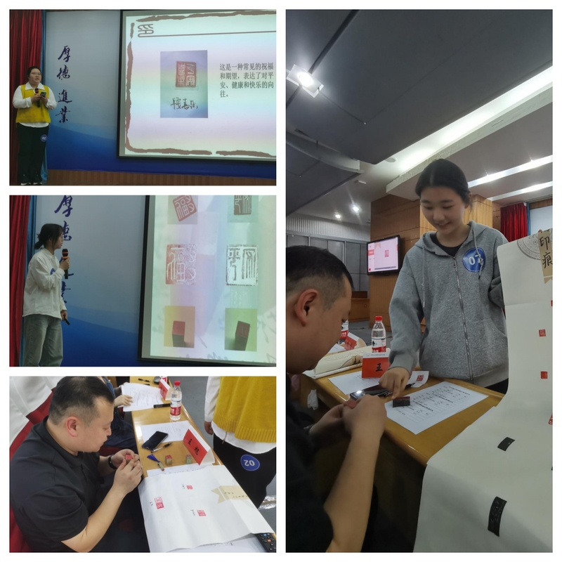 篆刻竞赛决赛特邀世界技能大赛精细木工项目负责人、国家级裁判、浙江省技能等级认定考评员王旭老师和篆刻专家冯日初老师作为评委亲临指导。在图书馆二楼报告厅,两位专家、明智学院(马克思主义学院)的教师代表、各学院的选手、观众,一起刻下工商印记,品味篆刻之美。