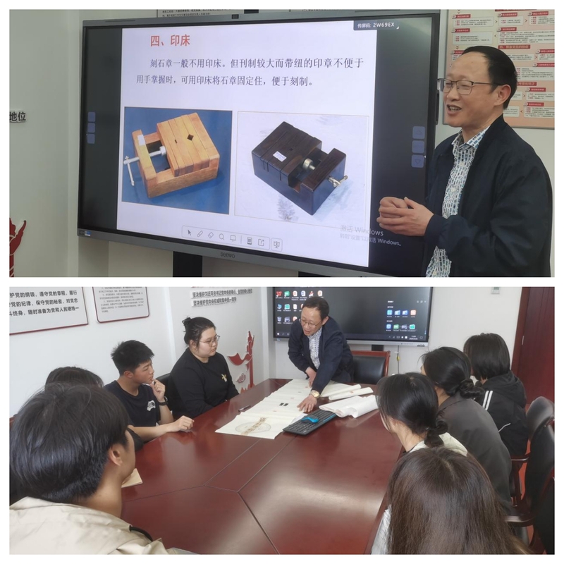 该竞赛由项目一作品释文、创作理念讲解(50分)和项目二印屏(50分)两部分组成,旨在展现大学生的讲解能力、篆刻技艺,并通过传播篆刻文化与汉字历史文化知识,推广和普及篆刻技能。经过精彩讲解和印屏展示与评分,最后电子信息学院姚哲等六名选手获奖。赛后,王旭老师对我校各位选手在赛场上的生动讲解以及他们的印屏作品表示了肯定,希望他们坚持热爱,发扬工匠精神,做好篆刻文化的传承者和篆刻技艺的继承人。冯日初老师还移步中和楼,给获奖选手们讲了一堂生动的印屏制作提升课。