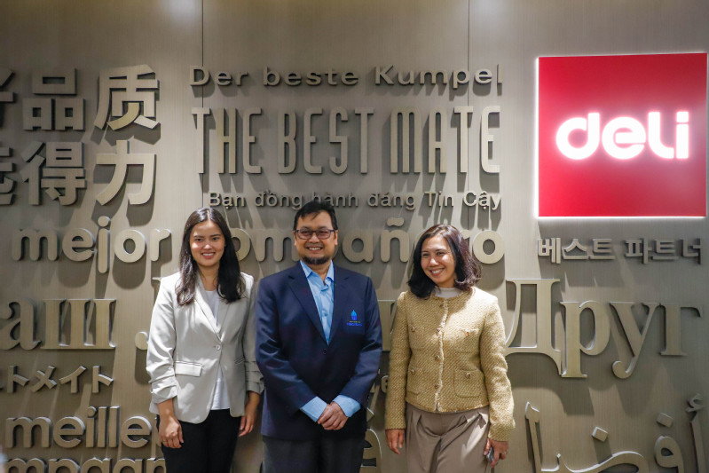 基于两校“直播与传媒海外学院”建设目标,在会议现场还举行了我校服务宁波得力集团“走出去”的合作协议签约仪式。宁波得力集团海外事业部总经理黄丰成表示,得力集团积极寻求海外市场的拓展,在印尼等东南亚国家打造从“产品出海”到“品牌出海”的文创科技产业集团的全球化之路,并在印尼首都雅加达开设了分公司,开展产品直播、销售等业务,面对日益扩大的企业规模,以及印尼人才供给现状,公司当前面临着人才供应不足以及招聘渠道受限等问题,希望通过印尼“直播与传媒海外学院”为企业提供学生实习就业、员工技能培训等合作方式,服务得力集团出海。会后,梅库布亚纳大学校长一行和我校师生前往宁波得力进出口有限公司现场参观,深入了解企业情况。