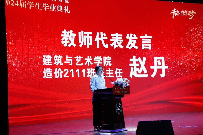 第二篇章“感恩·遇见你”以视频《我想对你说》为引,同学们向辛勤付出的恩师、后勤人员致以最真挚的感激之情,他们的默默奉献让校园生活更加美好和温馨。毕业班班主任代表建筑与艺术学院的赵丹老师结合工程造价专业中的“概算、预算、结算”对毕业生们深情寄语,希望同学们学会规划未来、勇敢行动、不断总结,用智慧和汗水书写属于自己的精彩人生。