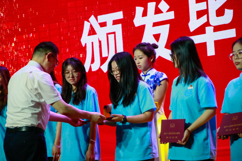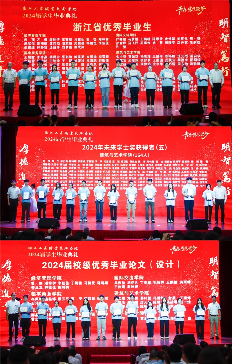 典礼现场为优秀毕业生们举行了隆重的颁奖仪式。党委副书记俞位增,副校长、党委委员应晓清为省级优秀毕业生颁奖;纪委书记、党委委员谢骏,副校长、党委委员张鹏飞为未来学士奖获得者颁奖;副校长、党委委员楼晓东,党委委员、宣传部部长陈军强为学校优秀毕业论文(设计)获得者颁奖。