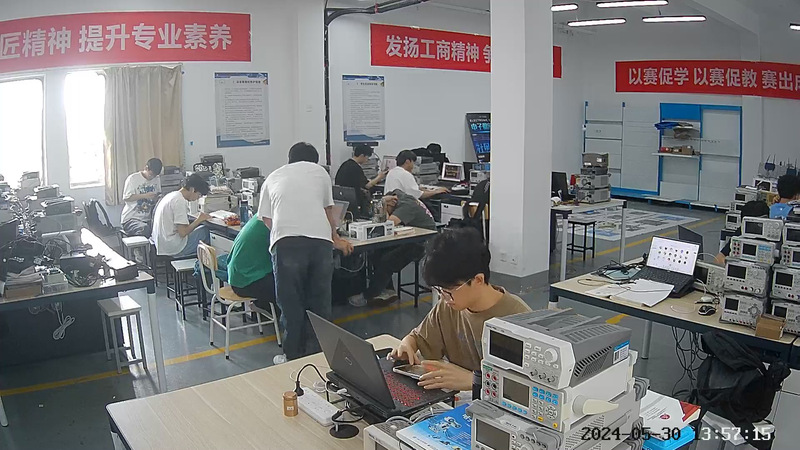 应用电子技术专业在校院两级领导、教务处等的关心支持下,高度重视学生竞赛项目,2024年共组织9组27位同学报名比赛,从2月开始积极开展赛前培训,讲解理论知识、进行实物制作训练。暑假期间更是克服天气炎热、住宿条件差等困难,开始进入封闭式培训模式。指导老师与备赛学生认真分析历届赛题,不断制作电路模块、编程调试、完成训练作品,力求精益求精。7月29日正式开赛,参赛学生通宵达旦、废寝忘食,经历四天三夜的鏖战,一路过关斩将,最终取得了优异成绩,充分展示了工商学子的风采,为学校争得了荣誉。