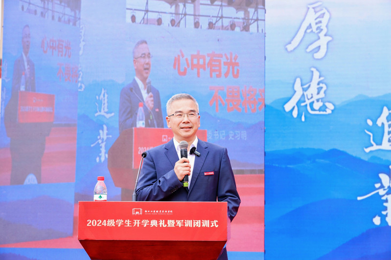 9月30日上午,2024级学生开学典礼暨军训闭训式在田径场隆重举行。学校党委书记史习明,校长、党委副书记张启富等校领导班子成员,中国人民解放军92343部队上校政治委员白永锋,中国人民解放军92877部队中校参谋长李学雷,全体教职员工、学校军训教导队全体队员、全体2024级学生参加了典礼。典礼由建筑与艺术学院传播与策划专业主任刘昊主持。“两翼”校区全体师生通过同步直播连线方式参加典礼。