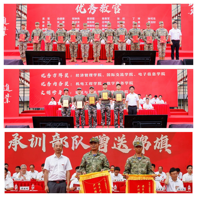 军训闭训式上,为期两周的军训成果一一展现。来自各学院的14个方阵喊着嘹亮的口号,迈着整齐划一的步伐,以饱满的精神状态接受检阅,展示出我校学子意气风发、蓬勃向上的风采。刺杀操、格斗拳、战地救护等军训会操表演展现了新生们勇于担当、坚韧不拔的精神风貌。党委委员、组织部(统战部)部长任一波为表现突出的优秀教官颁奖,党委委员、纪委书记谢骏为获评“优秀方阵奖”、“优秀内务奖”、“文明修身”奖的学院颁奖。俞位增向承训部队赠送了锦旗。