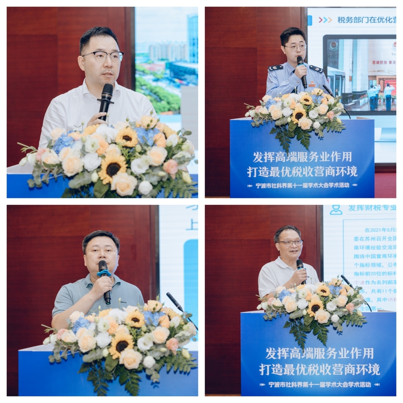 特邀嘉宾主题报告环节中,宁波和邦投资集团有限公司总经理陈晓云带来了题为《和邦解法:推动楼宇经济高质量发展》的主题报告;宁波正源税务师事务所有限公司总经理包新民分享了《利用财税专业咨询促进税收营商环境建设》的见解;宁波市税务系统的青年岗位能手白晟生以《税务部门多渠道多策略促进营商环境优化》为主题进行了发言;宁波日报报业集团的高级编辑李磊明围绕《完善税收制度优化税制结构助力全民共同富裕》展开了交流探讨。