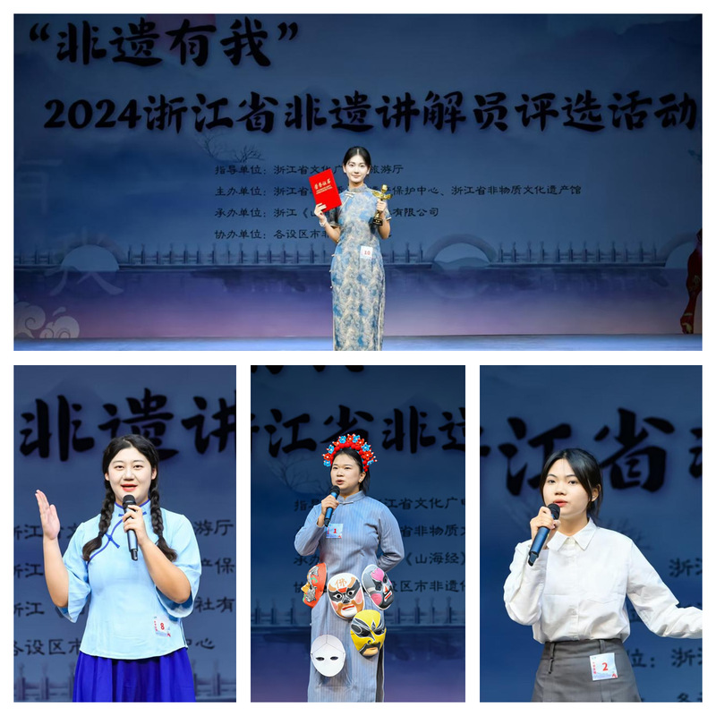 10月31日,在浙江省非遗馆举行的“非遗有我”2024浙江省非遗讲解员比赛中,我校广告2322班学生张奕宁获得“大学生组”金奖,旅游2322班学生游珍妮、旅游2272班学生刘晓乐、广告2311班学生费好获评“优秀讲解员”,我校成为该赛事获奖最多的高校。