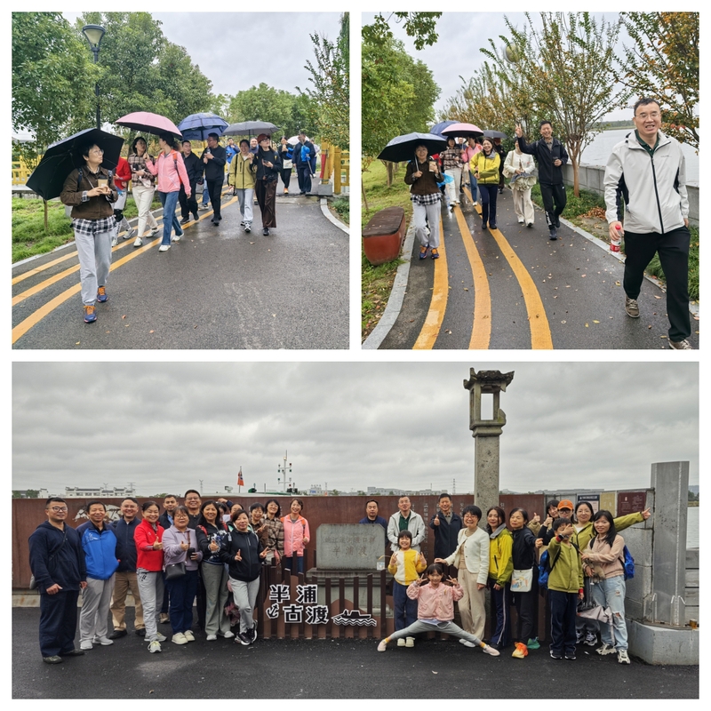 经过半个多小时的车程,健步走团队在校工会副主席、健步走协会会长韩包海的带领下,从跃进闸站进入西江健身步道。本次健走线路共6公里,前3公里为竞速赛,根据到达顺序,分别决出男女前八名。随着韩包海的一声令下,活动正式拉开序幕。尽管天空飘着绵绵秋雨,却阻挡不了健走爱好者们的热情。大家一路你追我赶,来到宋代水利工程小西坝,竞速赛至此结束。随后,大家一边欣赏江畔美景,一边继续前行,来到了位于半浦村的古渡口,在古渡口咖啡店内小憩,欣赏秋日姚江静静流淌,芦苇摇曳的美丽画卷。
