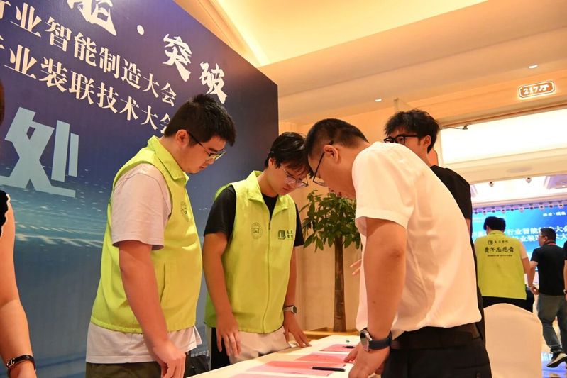 为保障大会高效运转,慈溪学院构建“党建引领+专业赋能+全员参与”的服务体系,实现“党员带头、学生全程融入”。以智能制造党支部、学生社区党支部为核心,组建由“党员教师+专业群学生”构成的专项服务团队,全程为参会企业服务,主持岗学生结合专业所学,在开幕式中解读“智能家电与电子装联技术的融合趋势”,让行业视角更贴近产业实践;音控屏控岗学生凭借电子设备操作专长,不仅保障演示视频切换流畅,更协助调试智能家电技术演示设备,解决2次突发信号不稳定问题;引导岗学生化身“产业服务专员”,除解答参会咨询、指导电子签到外,还主动介绍学院与本地家电企业的“校企共建实训基地”、“订单培养”模式;礼仪岗学生经“产业认知+礼仪规范”专项培训,在引导嘉宾入座时能简要介绍慈溪智能家电产业现状,展现高职学子的专业素养与县域情怀。党员教师先锋队牵头负责技术论坛统筹,协助行业专家整理智能家电领域前沿技术资料,现场为参会企业解答“电子装联质量管控”、“生产线智能化调试”等技术问题。