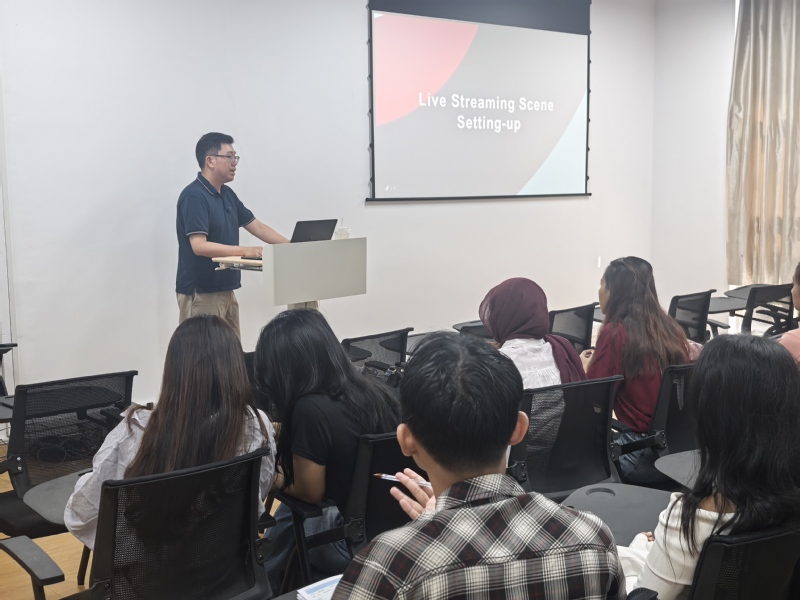 刘昊老师的TikTok直播运营课则聚焦实战,从解析平台“兴趣驱动”逻辑,到脚本设计原则,再到直播间搭建技巧,层层递进教学,最终以“得力文具推广” 模拟直播收尾。各组印尼学生分工协作,轮番上阵,首次尝试直播的Alia感慨:“之前觉得直播很简单,只要说话就行,真正做了才知道,什么时候介绍产品、什么时候促单、怎么介绍产品,都需要提前设计。刘老师让我看到并学习到了直播的幕后准备工作。”另一名学生Calista在尝试直播后评价,“让我特别意外的是,中国的直播行业已经发展得这么专业了。”这场沉浸式的直播实践,不仅是对课堂技能的落地检验,更成了中国先进直播技术的生动演示场。