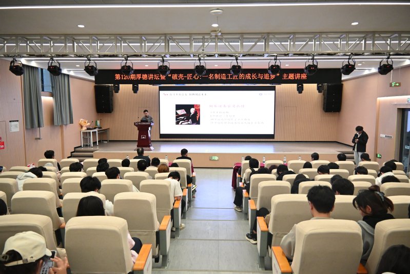 在专题讲座环节,汪闻东结合自己八年深耕模具制造领域的经历,向在场师生生动讲述了一名制造工匠的成长与追梦之路。2012年,他懵懂地选择了模具专业,在实训中逐渐找到动手实践的乐趣;入职方太后,他从最初对工作的排斥到受师傅影响确立工匠志向,通过轮岗实习深刻体会到“做好小事是做成大事的基础”。面对“鸡蛋打孔”等高难度挑战,他勇于突破思维定式,凭借自制钻头成功攻克难题。八年间,他总结出“热爱、梦想、专注、坚持、创新”五大心得,完成了从模具学徒到“浙江工匠”的蜕变。