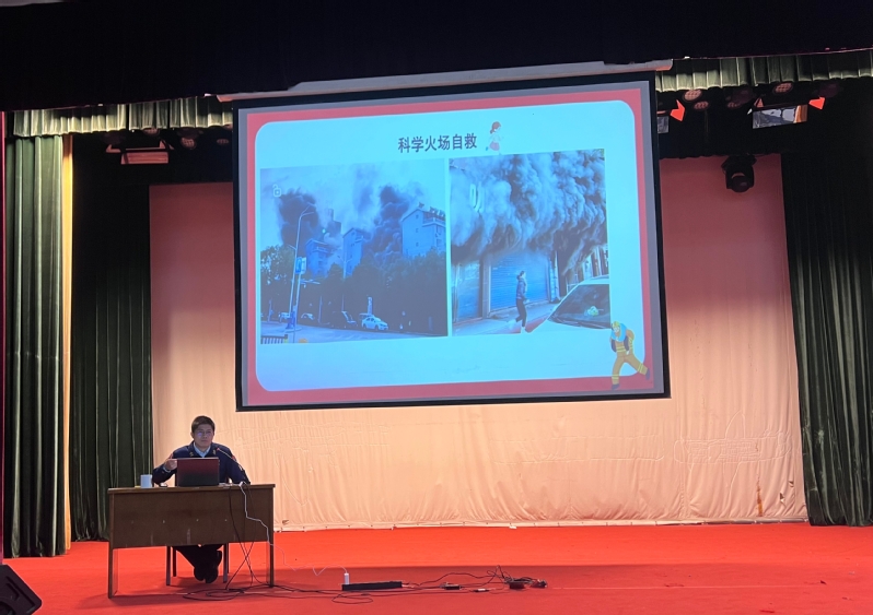 谢郑甬援引多起高校寝室火灾案例,拆解违规电器使用、易燃物堆积等常见隐患的致命危险。在现场投影展示的火灾实景——浓烟吞噬建筑、明火蔓延街巷的场景面前,他针对寝室这一特殊环境,详细讲解了“低姿弯腰、湿毛巾捂住口鼻、沿疏散指示标识撤离”的标准逃生流程,纠正了“盲目跳楼、贪恋财物”等常见误区。同时,他以演示动作配合讲解,现场说明灭火器“提、拔、握、压”的操作要领,明确“对准火焰根部、保持两米安全距离”的实操细节,让理论知识落地为可用技能。