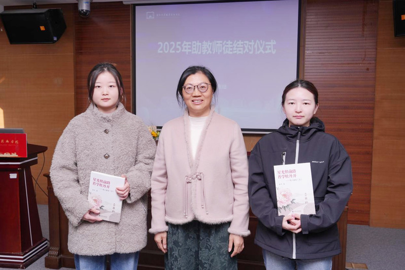 仪式最后,青年教师向指导教师敬赠鲜花,庄重的拜师礼让师徒情谊在仪式感中升温。教师教学发展中心胡平教授在仪式上赠给每位新教师自己编著的育人随笔一书,希望新教师能从中汲取育人智慧,在教育路上坚守初心。