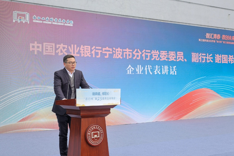 谢国希表示,中国农业银行宁波市分行一直致力以多种形式支持我校的科技文化节与商品展销会,积极助力学校在产教融合、实践育人方面的探索。他强调每一件作品、每一次交易,都是一次“价值”的启蒙,也是一份“信用”的积淀,要守护这份宝贵的初探,助力创意走得更稳、更远。他希望依托金融服务网络与资源,为学校育人实践、产教协同以及学子的成长发展,提供持续、温暖的支持。