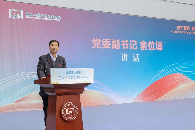 俞位增在开幕式致辞中指出,广大工商学子要坚守“商道匠心”,夯实能力之基,努力成长为既懂技术、又善经营的复合型人才;铸就品格之核,积极塑造既恪守商道格局、又秉持匠心态度的高素质技能。他介绍,今年的科技文化节精心打造了“数智匠心”“商韵文脉”“青春有我”“成长筑梦”四大篇章,既让师生触摸前沿科技,也助大家感悟商脉文心。俞位增强调,商品展销会不仅是一次全校性活动,更是一堂生动的商业实践课,要引导学生在真实经营中深刻体悟“商道即人道,匠心即本心”的实践内涵。他希望全体教师以此次活动为契机深化教学改革,各部门联动协作搭建平台,合作企业持续助力、实现共赢,共同为学生的青春梦想铺路搭台。