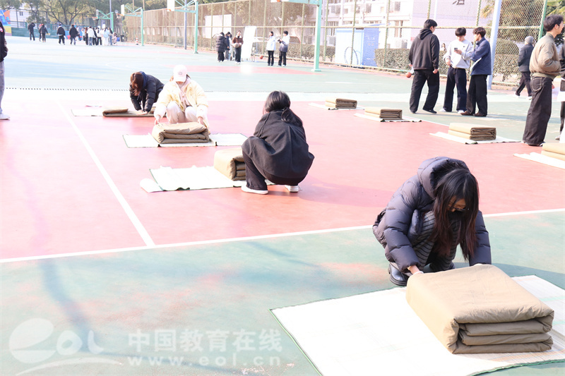 比赛现场,参赛选手们或跪地捋平褶皱,或借助卡片打磨被角,在方寸之间展现耐心与细致。赛前,有着入伍经历的国旗护卫队队员进行了规范演示,详细讲解铺平、压实、捏线等动作要领。比赛过程中,选手们专注于铺叠、修整,现场气氛紧张有序,形成了一道独特的校园风景线。