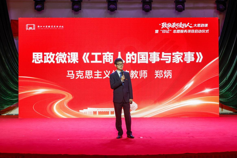 马克思主义学院教师郑炳以《工商人的国事与家事》为题,讲述了两代“工商榜样”的家国担当,呼吁师生将“天下兴亡,匹夫有责”的担当融入日常、付诸行动。
